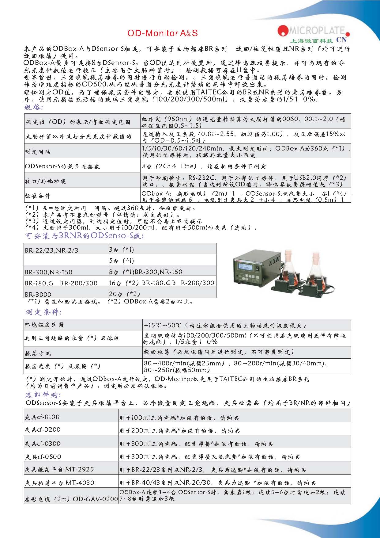 由于细菌及其他微生物生长曲线测定需定时取样,操作繁琐,因此可采用传感器监控OD值,无需取样传感监控,以简化大量的实验操作。而大肠杆菌,酵母菌等微生物需在恒温摇床内振荡培养,使用OD-Monitor 浊度计可以在振荡进行中对于OD600进行精确测定。OD-Monitor振荡比浊法在实验室及工业应用中因其高效率和高精度将会有广阔的应用前景。
